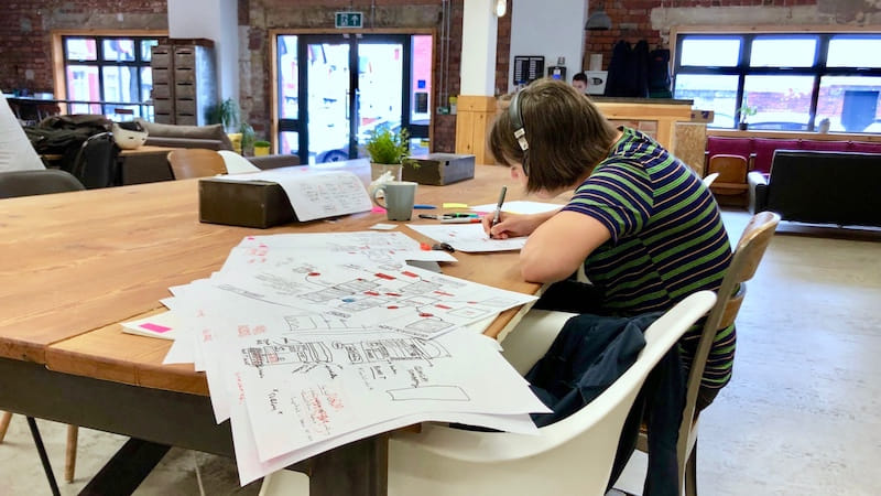 One of the things I have focused on is drawing UX rather than jumping into design programmes. At this stage it allows us to easily draw ideas in conversation and not muck about setting up documents. Plus there’s nothing quite like scrunching up an idea you want to ditch!