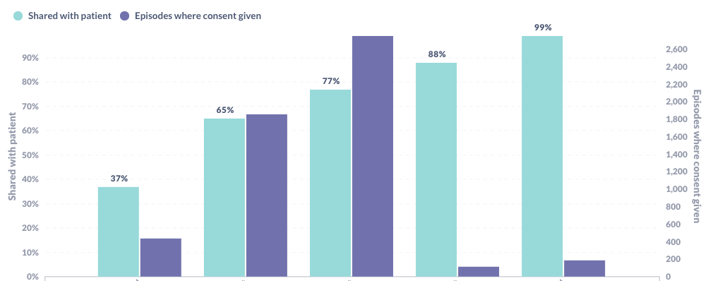 Over the past couple of years, the legal and ethical standpoint against day of surgery/treatment consent - unless absolutely necessary - has become clearer, but we can tell that this remains a widespread practice. There is more work to do to really understand what our Concentric data shows us - particularly relating to the quality of any consent conversation that may have been had prior to what looks like a ‘day of surgery’ Concentric consent. However, I think we can be reasonably confident that for around 1 in 2 patients, a significant amount of new consent information, and documentation of consent, is happening on the day of treatment. There is significant variation here between different organisations, types of organisation, and specialties within an organisation.